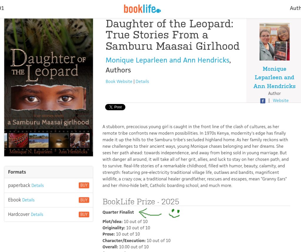 We’re thrilled that Daughter of the Leopard, with its fabulous 10/10 Critic’s Report, was awarded Quarterfinalist in the 2025 BookLife Prize, memoir/autobiography category. Only two other 10/10s surpassed us. Delightful, and an honor.